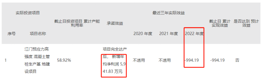 2月20日晚,公司也更新了IPO募投项目情况。截至2022年底,募集资金约3.6亿元投入完毕,募投项目“江门预应力高强度混凝土管桩生产基地建设项目”达到预定可使用状态,不过项目2022年的效益为-994万元。
