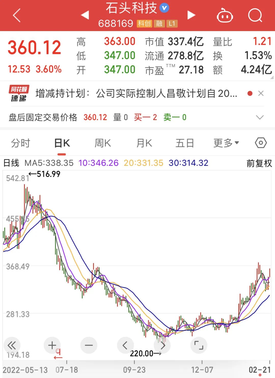 2月21日晚间石头科技公告称,公司控股股东、实际控制人昌敬计划根据市场情况,通过集中竞价的方式减持其所持有的公司股份合计不超过187.38万股,拟减持股份数量占公司总股本的比例合计不超过2%,减持期间为本公告披露15个交易日后的6个月内。截至公告披露日,昌敬持有公司股份2169.4万股,占公司总股本的23.15%。按照石头科技最新股价360.12元/股计算,昌敬计划减持的股份市值约为6.75亿元。