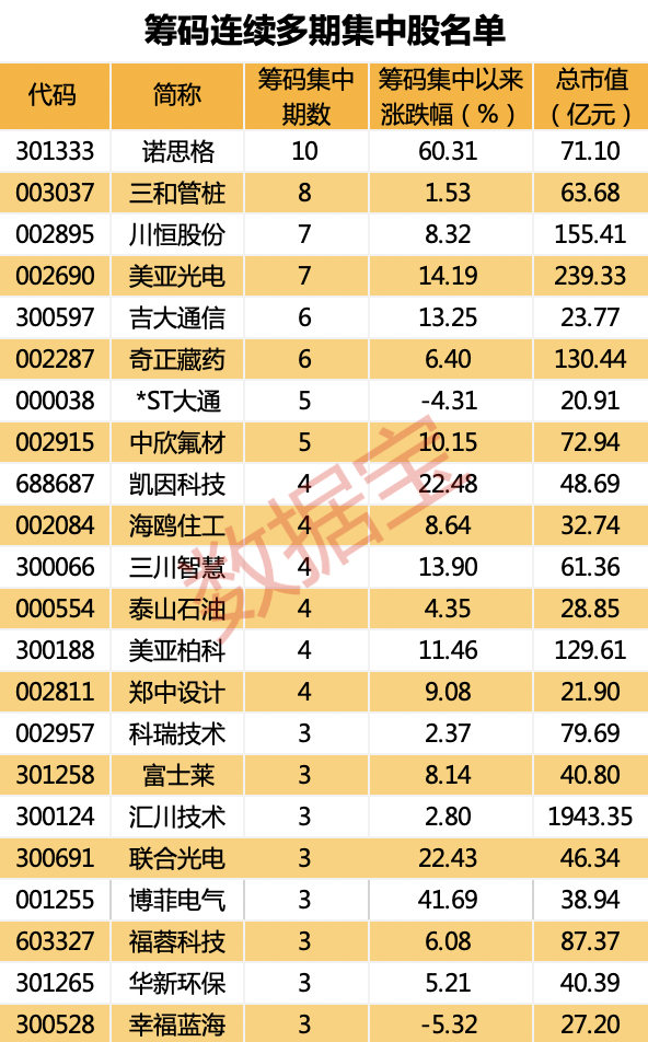 数据宝统计,与之前各期的股东数据相比,22股的股东户数连续减少3期以上,股东户数最多的已连降10期,筹码呈持续集中趋势。