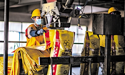 工人在云天化天安化工磷肥制造中心生产线进行袋装操作。新华社记者 江文耀 摄