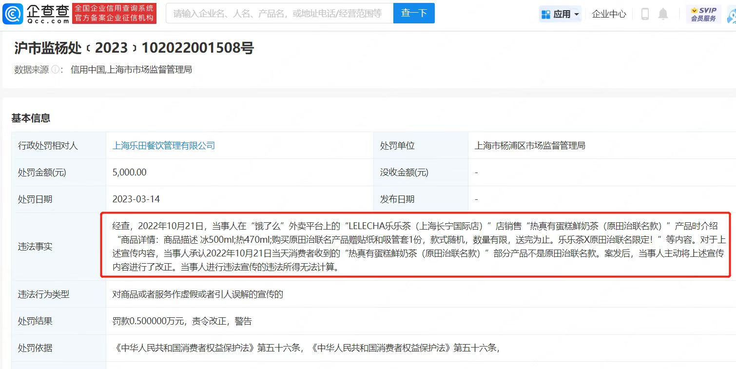4月6日,天眼查App显示,近日,乐乐茶主体公司上海乐田餐饮管理有限公司因对商品或者服务作虚假或者引人误解的宣传,被上海市杨浦区市场监督管理局罚款5000元。