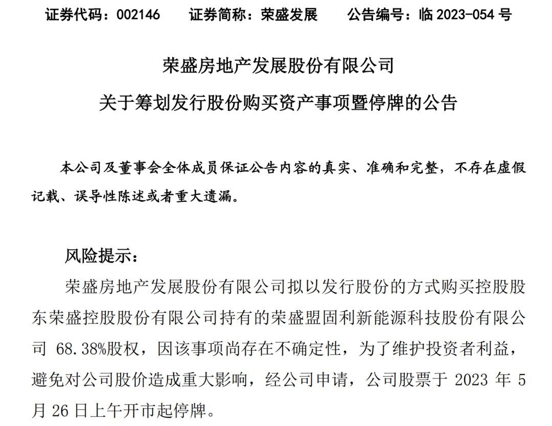 深交所5月26日盘前公告,荣盛发展拟筹划发行股份购买资产事项,公司股票于5月26日开市起临时停牌。停牌原因周日揭晓。荣盛发展5月28日晚间公告,公司拟以发行股份的方式购买控股股东荣盛控股持有的盟固利68.38%股权。
