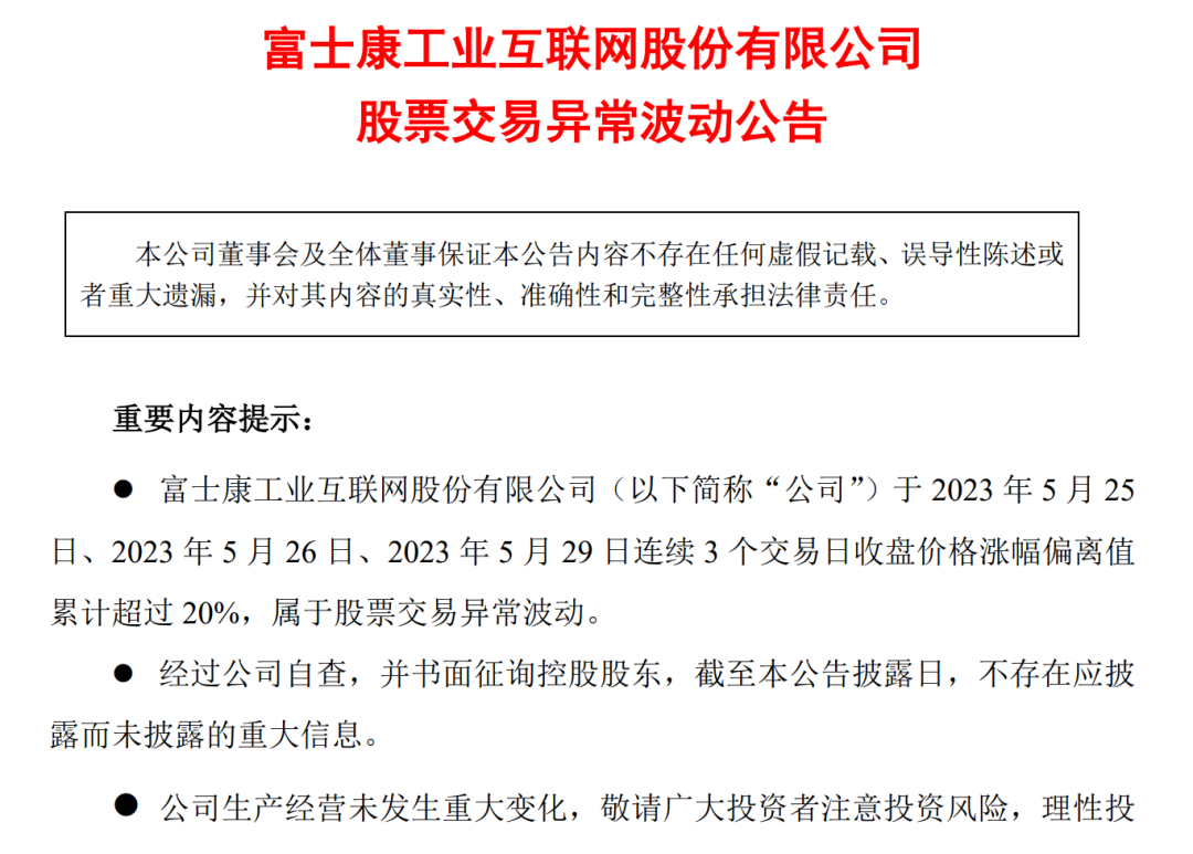 因AI服务器代工业务备受资本市场关注的工业富联,股价也连续上涨。5月29日工业富联发布异动公告,表示公司不存在对公司股票交易价格产生影响的媒体报道或市场传闻,目前生产经营活动正常,日常经营情况未发生重大变化。