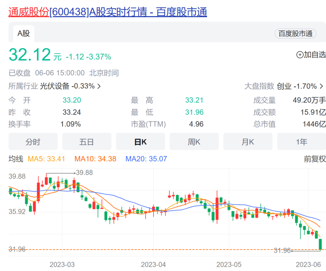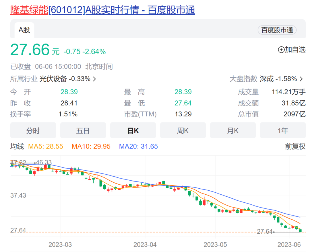 从市场表现来看,今年以来通威股份股价累计下跌近17%,隆基绿能股价累计下跌近35%。