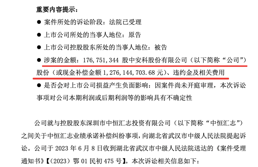 6月8日公告显示,*ST中安起诉请求判令中恒汇志立即交付1.77亿股中安科股份。若无法足额交付股份,则请求判令其将交付不足部分的股份数量折算为现金补偿,现金补偿金额=不能交付的股份数量*股份发行价格(即7.22元/股)。