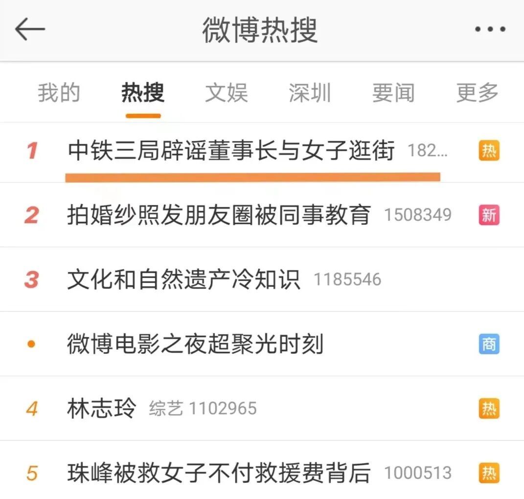 据券商中国,今日上午,#中铁三局辟谣董事长与女子逛街#这一话题冲上微博热搜第一。此前一天,即6月10日,针对网传“董事长搂着女子逛太古里”一事,中铁三局集团发布严正声明称,个别网民无中生有,借热点事件对该公司董事长郝刚进行恶意中伤、造谣诽谤。目前公司已在太原和成都两地报案。