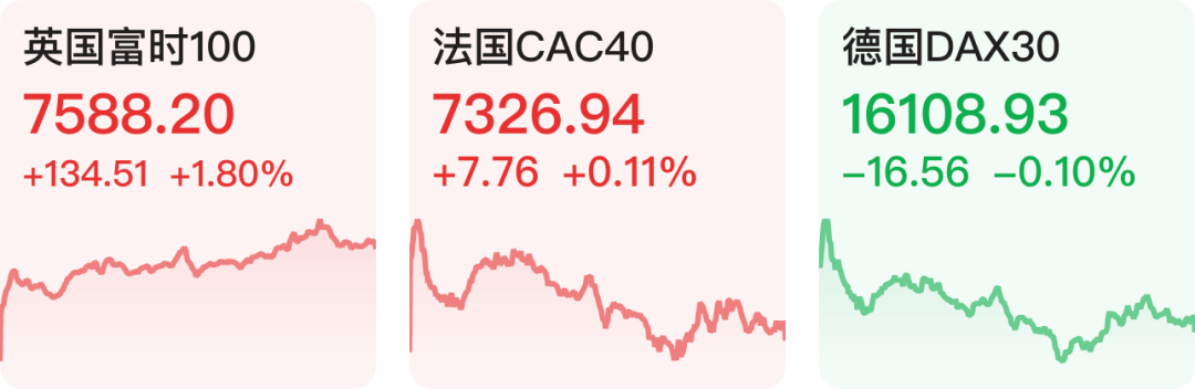 欧洲三大指数涨跌不一。截至收盘,英国富时100指数涨1.8%,法国CAC40指数涨0.11%,德国DAX30指数跌0.1%。