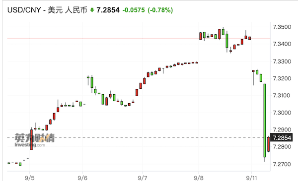 9月11日,央行发布最新数据,8月社会融资规模3.12万亿元,同比增长9%,M2同比增长10.6%,均超出预期;同日,全国外汇市场自律机制专题会议召开,提出坚决防范汇率超调风险。在此拉动下,人民币对美元大幅反弹,从上周逼近7.35的位置一度升至7.27附近,最大涨幅700点。