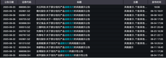 其中涉及金额较大的微光股份,8月以来已先后3次发布逾期兑付风险。9月15日公告显示,公司购买的今年9月11日至9月15日到期的4只中融信托产品逾期未能兑付,合计金额2.3亿元。这些产品的预期年化收益率在5.4%至6.3%之间。