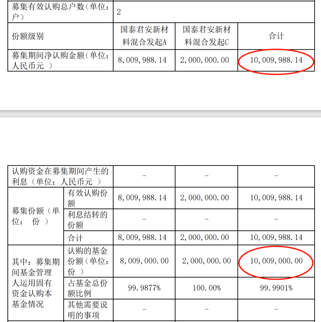 日前,有媒体报道称,国泰君安新材料混合型发起式基金基金合同显示,该基金首发最终规模为1000.998814万份,而其中国泰君安资管固有资金认购1000.9万份。由于该基金的募集期仅9月15日一天,且有效认购户数仅2户,前述数据也意味着,剔除公司自购金额外和认购费率外,该基金首发当日,仅1名客户买了1000元。