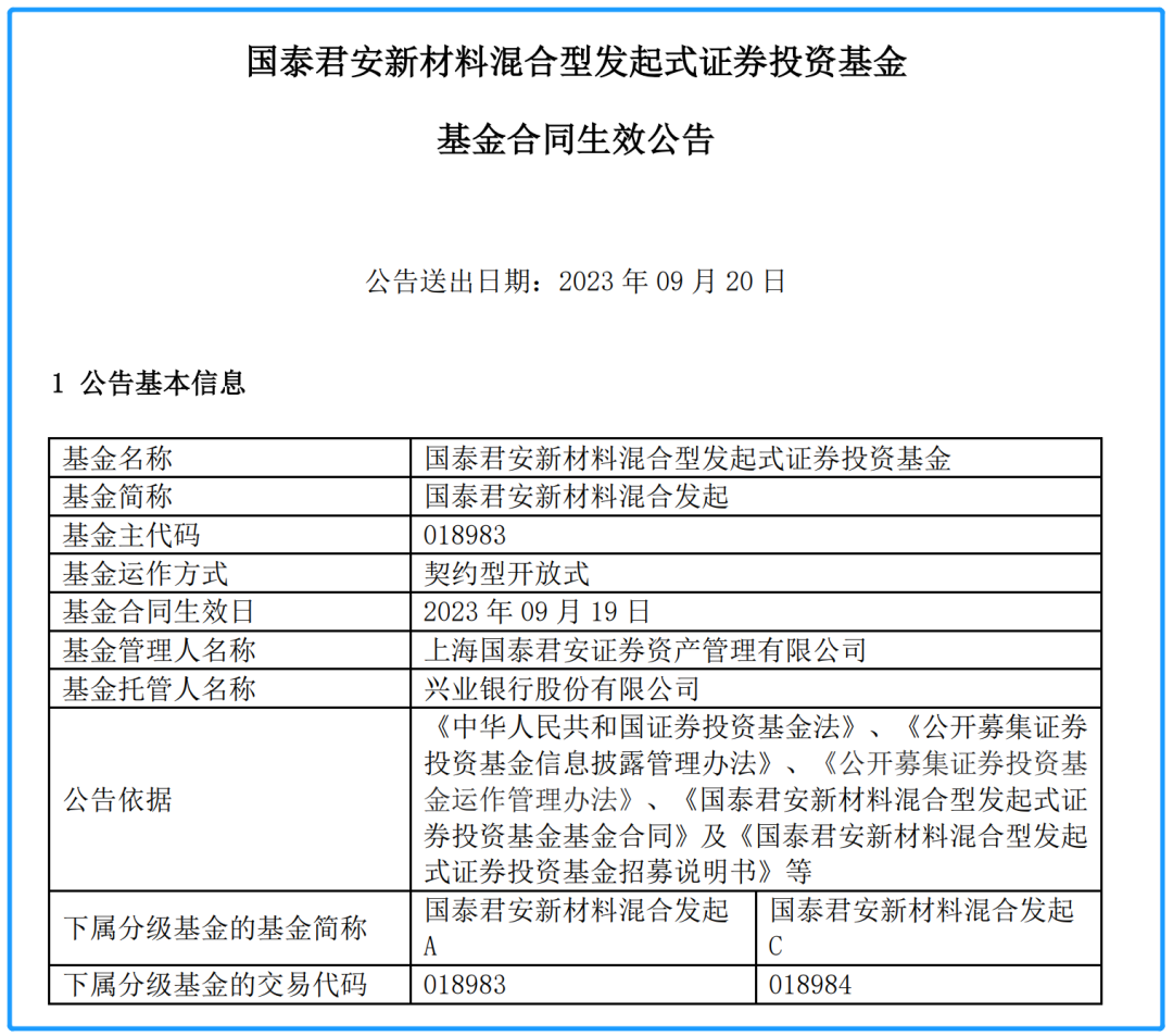 对此,证券时报·e 公司记者登陆国泰君安资管官网,并查询到了国泰君安新材料混合型发起式证券投资基金基金合同生效公告。