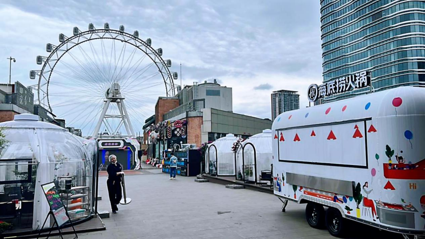 比如,在上海,静安大悦城顶楼的标志性打卡点摩天轮下面,海底捞摆出了一个个“星空泡泡屋”,让消费者们边吃火锅边观景;海底捞太原万科城店将商场户外平台布置成了都市露营地。在北京、深圳、武汉、西安、郑州等多个热门旅游城市的海底捞,也带来了夜市小吃外摆、露营火锅、天台火锅等多元化的新体验。