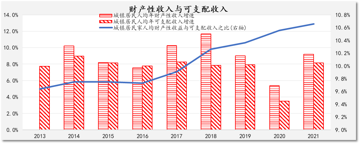 图表 1居民财产性收入与可支配收入(数据来源:国家统计局)