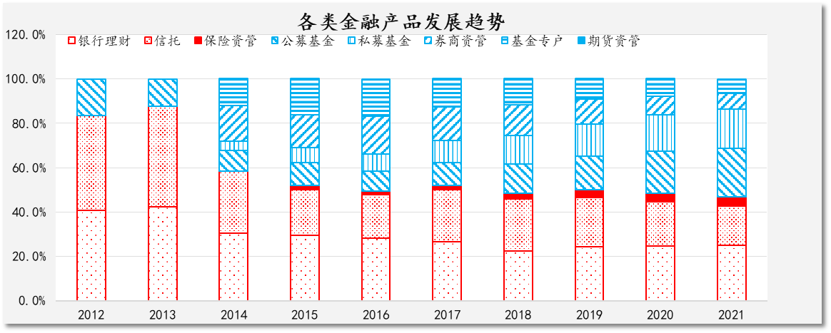 图表 2全市场各类金融产品发展趋势(数据来源:基金业协会、银保监会)
