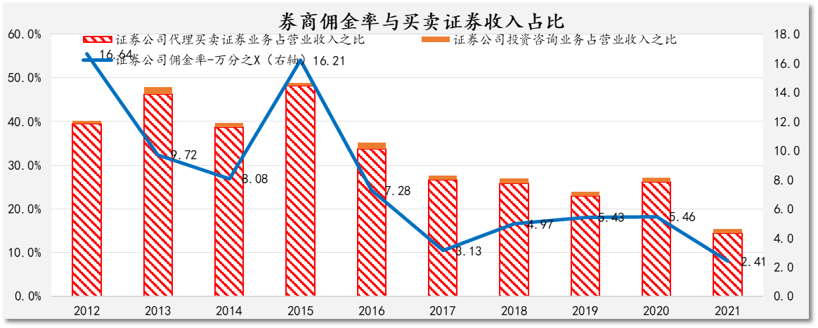 图表 4证券公司佣金率与买卖证券收入占比(数据来源:证券业协会)