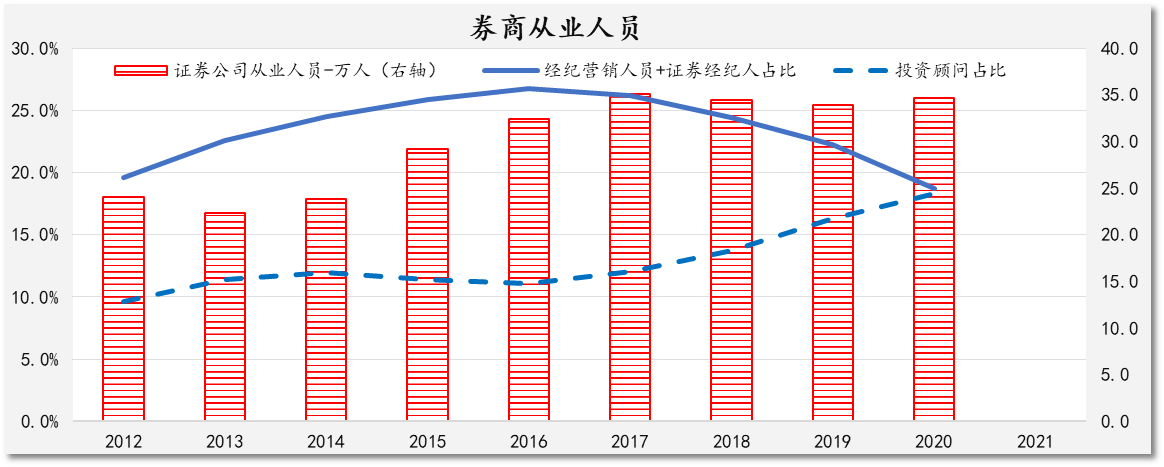 近年来,各家证券公司均努力打造投资顾问队伍,以相对专业的投资顾问队伍逐渐替代相对传统的经纪营销人员和证券经纪人。从证券业协会统计数据来看,截至2020年,经纪营销人员和证券经纪人占证券公司从业人员的比例从顶峰的近27%已经下滑到2020年的18.7%,而同期投资顾问占证券公司从业人员的比例从2012年的10%上升到2020年的18.3%。在近五年证券公司从业人员逐渐增长的时期,二者在证券公司从业人员中的占比体现出此消彼长的特征。