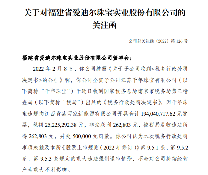 上述事宜披露后,2月8日,爱迪尔便收到了深交所对此事的关注函。深交所表示,公司在2021年9月18日披露的《关于对深圳证券交易所问询函的回复公告》中称,2020年5月25日,千年珠宝收到税局下发的《税务事项通知书》,2021年5月13日,千年珠宝向税局补充提交了相关书面陈诉、申辩报告等材料。截至回函日,千年珠宝没有接到税局的后续通知要求及情况反馈,公司也未收到相关监管和执法部门的调查结果或处罚决定,深交所对此表示关注。