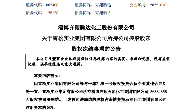 就在3月16日晚间,齐翔腾达公告称,近日收到间接控股股东雪松实业集团有限公司(以下简称“雪松实业”)通知,获悉雪松实业持有的齐翔集团3638.356万元的股权因雪松实业等与平潭汇垠一号股权投资合伙企业其他合同纠纷一案,被司法冻结,被司法冻结的股权占齐翔集团注册资本的80%,冻结期限为三年。
