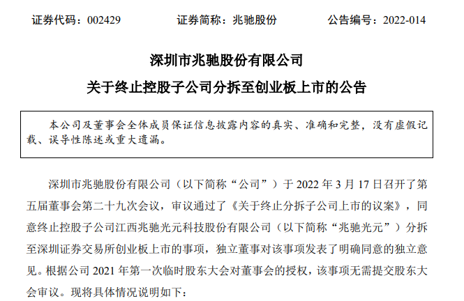 3月17日晚间公告显示,公司控股股东及实际控制人近日拟筹划转让公司实际控制权,如该事项顺利完成,则控股子公司兆驰光元的实际控制人亦会发生变更,导致后者符合创业板首次公开发行股票的条件,公司因此决定终止兆驰光元分拆至创业板上市事项。