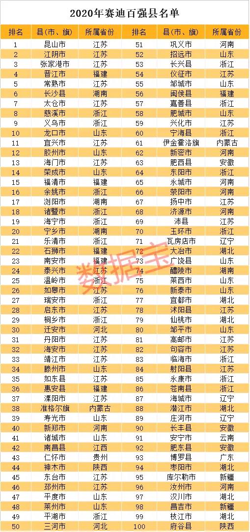 7月28日,赛迪顾问县域经济研究中心编制的《2020中国县域经济百强研究》(下称报告)正式发布。据悉,赛迪顾问直属于工业和信息化部中国电子信息产业发展研究院,是中国首家上市的咨询企业。榜单数据显示,百强县前十位依次是:昆山市、江阴市、张家港市、晋江市、常熟市、长沙县、太仓市、慈溪市、义乌市、龙口市。前三甲席位未发生变化,晋江市和常熟市发生易位,太仓市排名上升2位,慈溪市下降1位,而义乌市则新晋百强县前十位。