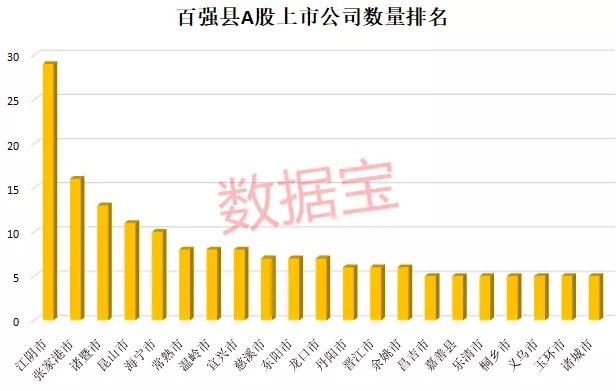 从上市公司数量规模来看,排在前五位的百强县依次是:江阴市、张家港市、诸暨市、昆山市、海宁市。这些百强县均来自长三角地区,其中江阴市上榜公司数量29家再次蝉联榜首。