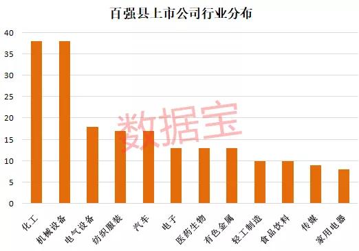 分行业看,百强县域内上市公司主要集中在传统制造业领域,如化工、机械设备、电气设备、纺织服装、汽车等,其中化工、机械设备行业公司均有38家,数量最多。化工领域,百强县培育了包括中国巨石、华峰氨纶、玲珑轮胎、桐昆股份、道恩股份等细分领域龙头,机械设备领域,培育了新界泵业、浙矿股份、慈星股份、江苏神通等公司。