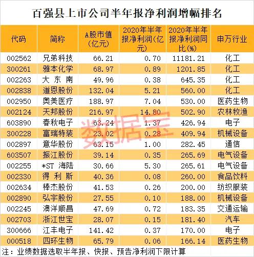 从业绩表现来看,2019年百强县上市公司合计实现营收1.49万亿元,占A股总数比例为2.97%;合计实现盈利863.47亿元,占A股总数比例为2.3%。今年突如其来的新冠肺炎疫情,对实体经济造成了较大冲击,百强县域内上市公司也受到波及。据统计,按照半年报、快报、业绩预告净利润下限计算,百强县域内共计64家上市公司今年上半年净利润有望同比增长,占比55.65%。
