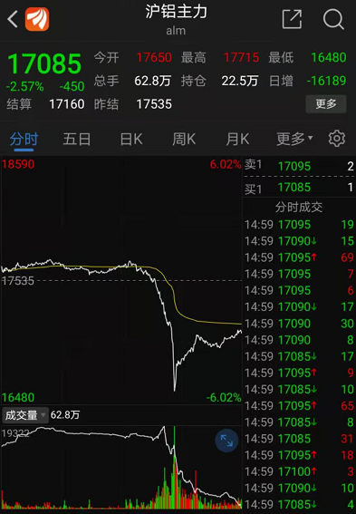 早盘有消息称,国储试图抛售之前收储铝锭,已与国内铝业巨头探讨实施可能性,传言所涉数量约为50-80万吨,但具体详细方案尚未明确。在此消息影响下,内盘铝价早盘录得大跌,上海期货铝合约触及跌停。10点50分左右,市场信心有所恢复,期价开始大幅反弹。截至收盘,沪铝主力连续收报17085元人民币/吨,下跌2.57%。国泰君安期货分析师称,市场走势正在反映对国储投放的猜测。