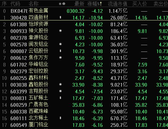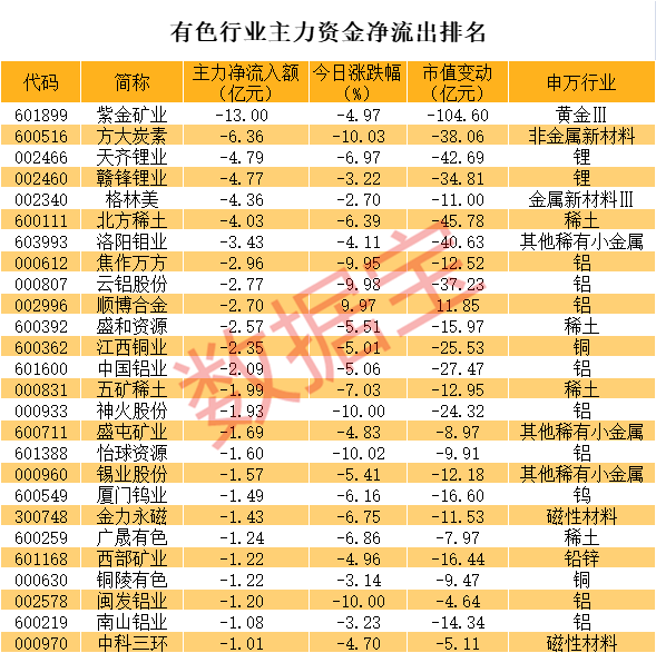 部分有色股受到波及,章源钨业跌停。稀土板块的广晟有色、北方稀土等跌逾5%,锂板块天齐锂业、盛新锂能等大跌逾5%。整体来看,整个有色板块今天A股市值蒸发近900亿元。其中,紫金矿业市值蒸发超过百亿元,北方稀土、天齐锂业、洛阳钼业、方大炭素、云铝股份等20股市值蒸发超10亿元。主力资金也大幅流出有色板块,合计净流出近百亿元,紫金矿业流出近13亿元,方大炭素、天齐锂业、赣锋锂业等20多只个股净流出超过亿元。