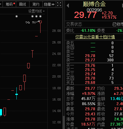 不过,同为铝板块的顺博合金,股价却依然很坚挺。今天早盘,顺博合金承接此前连续涨停潮大幅高开,并于9点33分左右即触及涨停板,此后虽数次打开涨停,收盘依然上涨9.97%,距离涨停仅差1分钱。自此,在短短的10个交易日,顺博合金从13.21元,飙涨至29.77元,涨幅125%。
