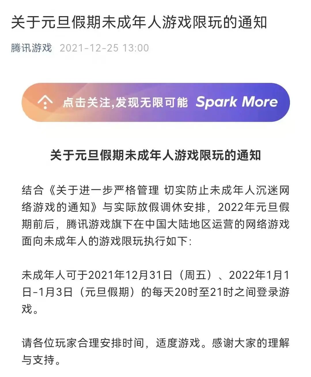 腾讯游戏今日发布《关于元旦假期未成年人游戏限玩的通知》。《通知》称,2022年元旦假期前后,腾讯游戏旗下在中国大陆地区运营的网络游戏面向未成年人的游戏限玩执行如下:未成年人可于2021年12月31日(周五)、2022年1月1日-1月3日(元旦假期)的每天20时至21时之间登录游戏。请各位玩家合理安排时间,适度游戏。