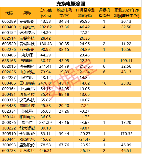 证券时报·数据宝统计,A股换电概念共24股。概念股11月以来表现强势,平均上涨12.53%;其中,罗曼股份、许继电气涨幅居前,分别为95.95%、46.42%。机构对于国电南瑞、协鑫能科、山东威达较为关注,各有16家、6家和6家机构参与评级。国电南瑞拥有自主知识产权的电池更换及重卡换电设备,目前已在全国9个省区建设了不同类型数十座换电站,新一代重卡换电站已在南京市溧水区投运。