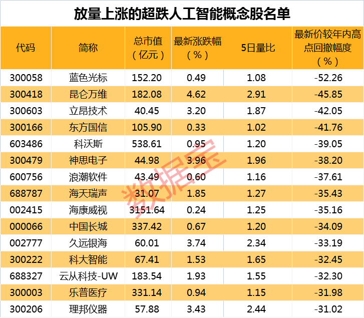 人工智能概念股中,有多只股的最新收盘价较年内高点深度回调,26股超跌幅度大于30%。其中蓝色光标、昆仑万维、立昂技术等个股的股价较年内高点回调超40%。这些超跌股中,昆仑万维、理邦仪器、久远银海、立昂技术、科沃斯等在周五的交易日中均放量上涨。(数据宝 郭洁)