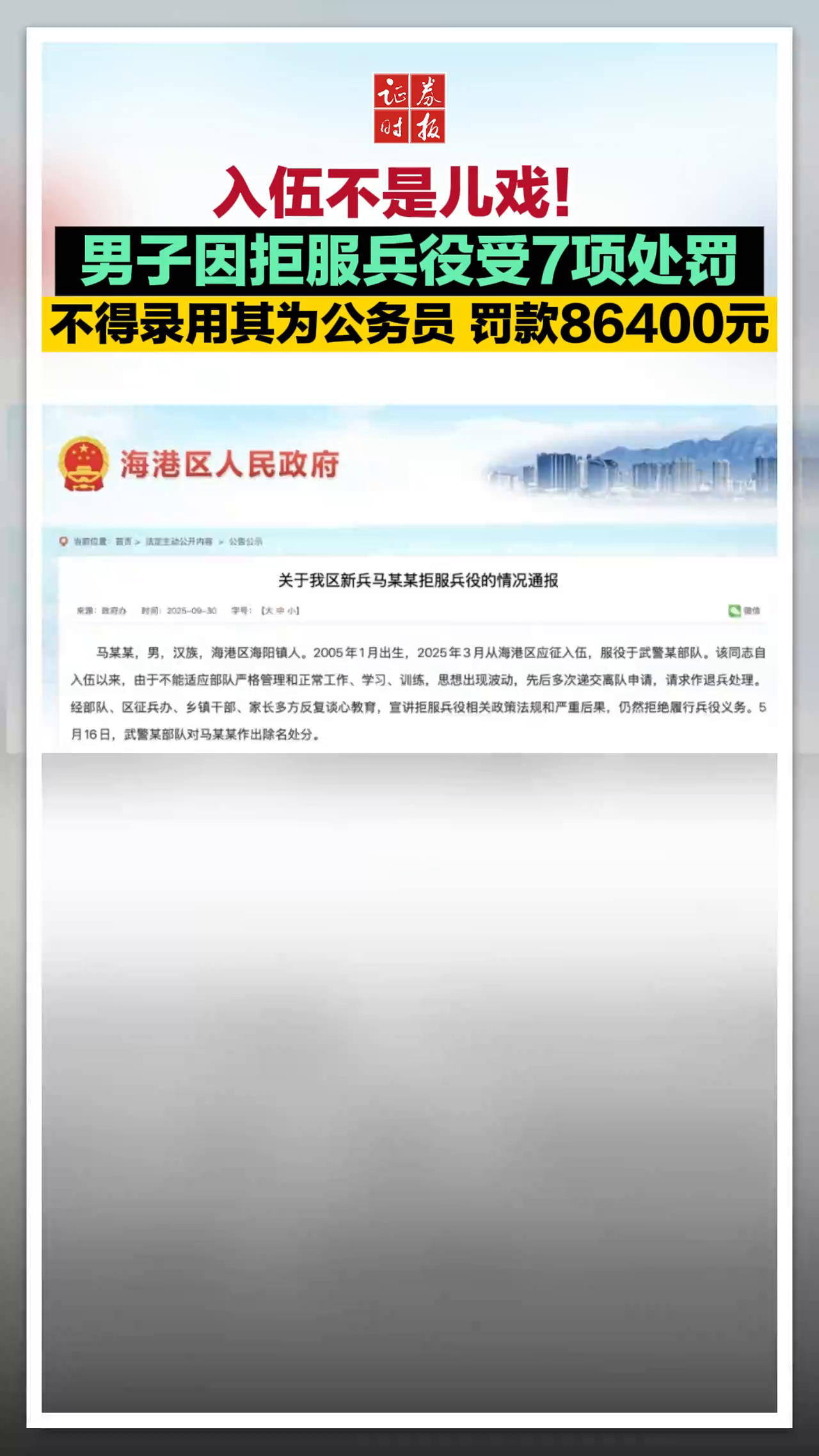 入伍不是儿戏!男子因拒服兵役受7项处罚 不得录用其为公务员 罚款86400元