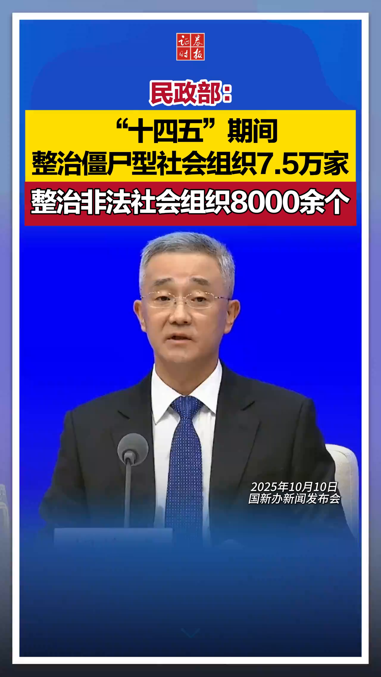 民政部:“十四五”期间整治僵尸型社会组织7.5万家,整治非法社会组织8000余个