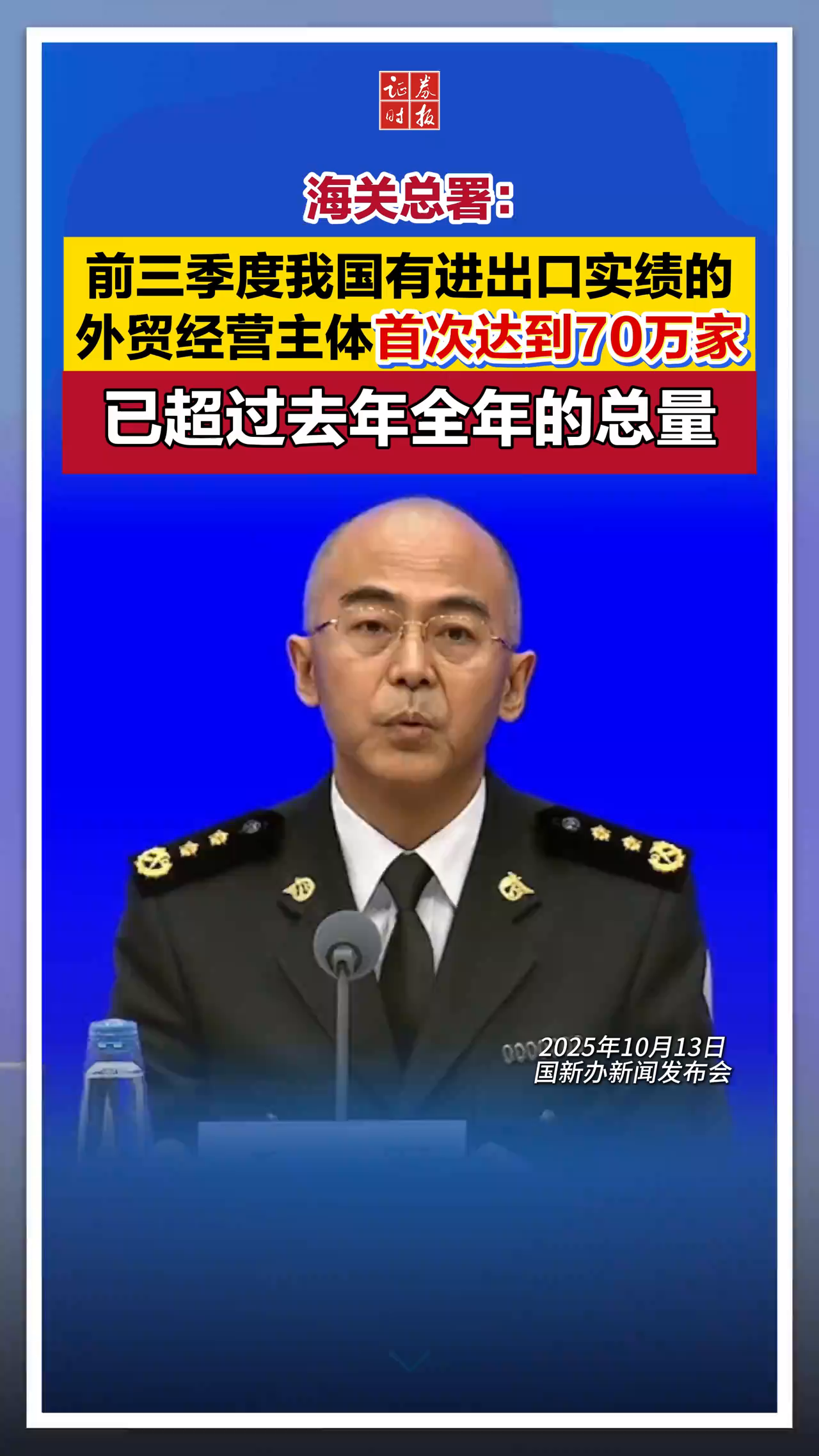 海关总署:前三季度我国有进出口实绩的外贸经营主体首次达到70万家,已超过去年全年的总量
