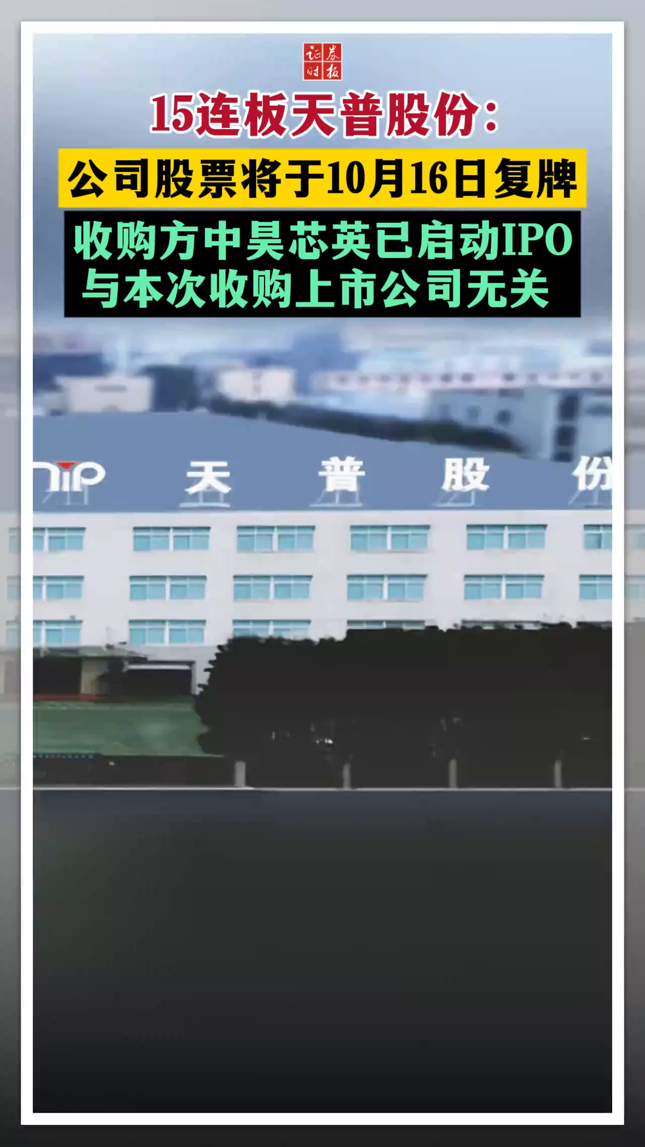 15连板天普股份:公司股票将于10月16日复牌 收购方中昊芯英已启动IPO 与本次收购上市公司无关