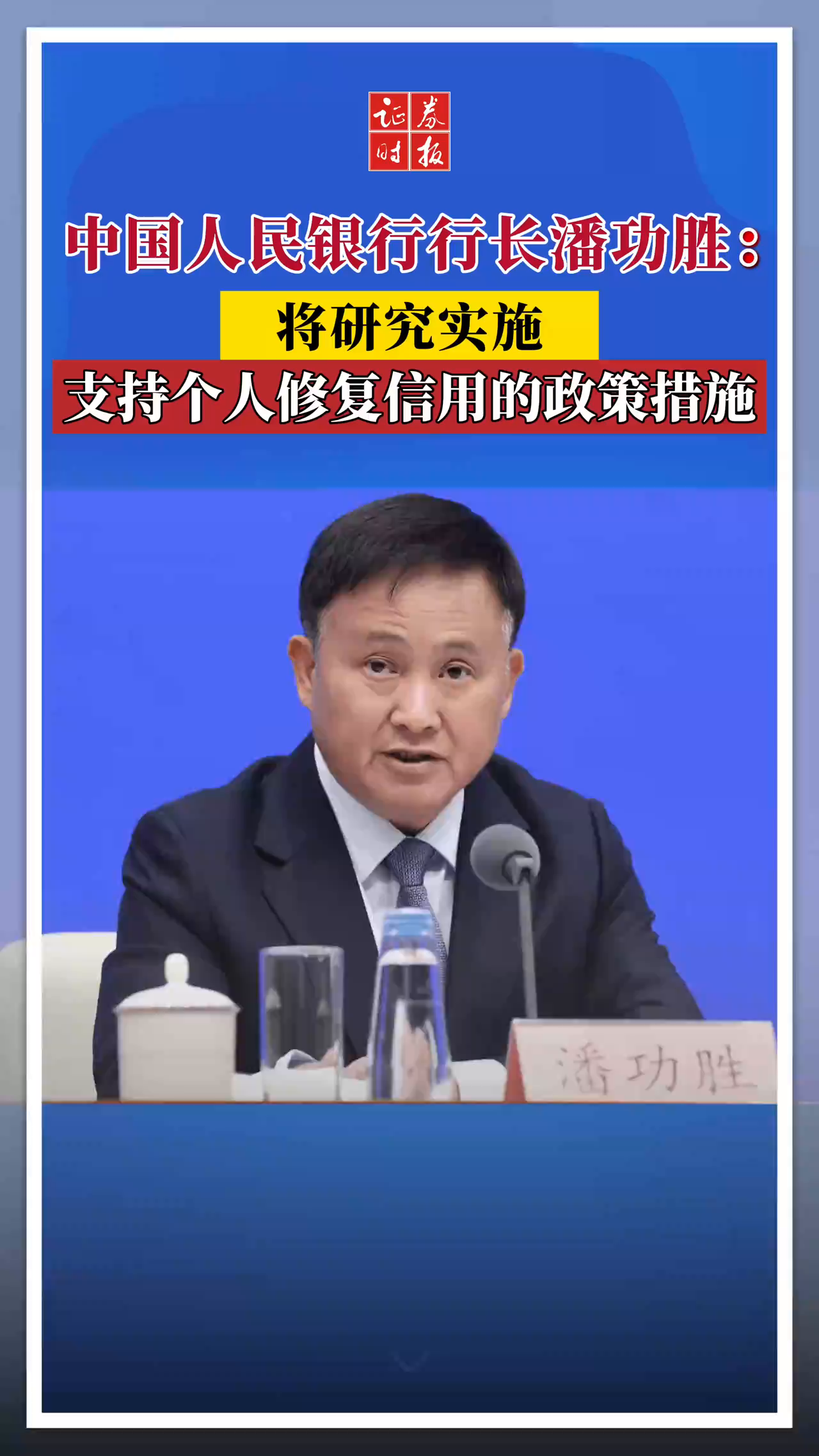 中国人民银行行长潘功胜:将研究实施支持个人修复信用的政策措施