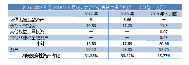 就力合科创的资产构成而言,主要看可供出售金融资产、长期股权投资、其他权益工具投资、其他非流动金融资产四项投资性资产占总资产的比例。历年数据显示,这四项资产占比逐年攀升。截至2019年6月底,四项投资性资产合计20.66亿元,占同期力合科创57.75亿元资产的35.77%(表2)。这意味着,其投资性业务仍然占有不小的分量。