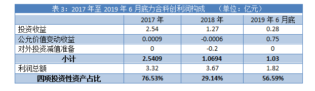 就力合科创的利润构成来看,主要是分析投资收益、公允价值变动收益,以及对外投资减值三项收益之和对利润的贡献程度。从2017年开始,力合科创的投资业务对利润的贡献度整体呈下降趋势,从2017年的76.53%下降到2019年6月底的56.59%(表3)。这也意味着,即使力合科创投资业务占有不小的分量,但因其他两项业务发展速度快,投资业务对其利润的贡献越来越小。