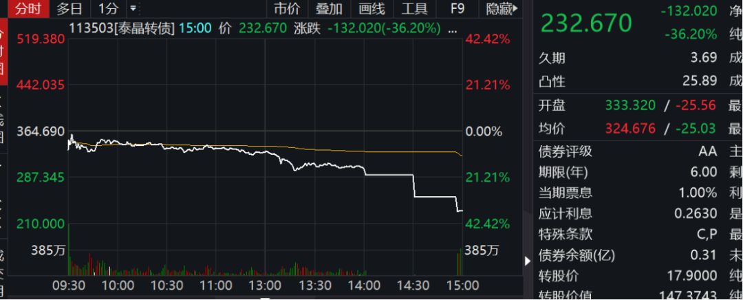 被二次临停后,泰晶转债下午2点57分恢复交易,最终收盘价232.67元,跌幅36.2%。换手率1831.69%。而在前一个交易日,泰晶转债盘中最高价达到420元,两天之间价格几乎打折。