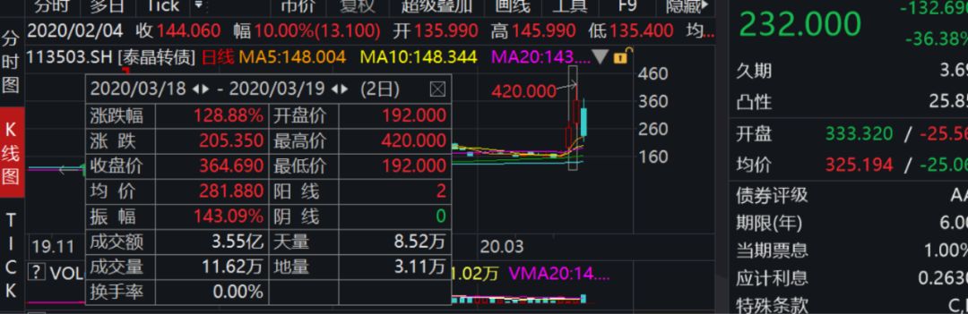 在此前两个交易日,泰晶转债价格翻了一倍多。3月18日到19日,泰晶转债猛涨两天,两个交易日因为价格飙升四次临停,价格最低时192元,最高价420元,振幅143.09%。