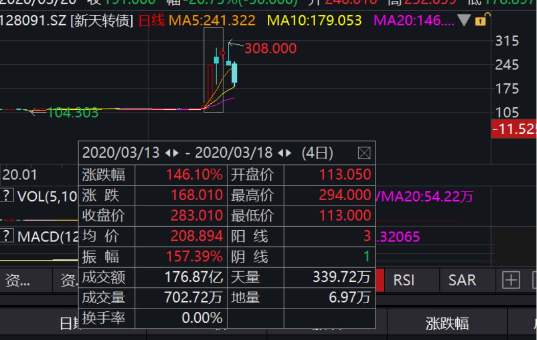 新天转债继续下跌,跌幅达20.75%,收盘价191元,该转债的正股今日也跌停。此前新天转债从3月13日到3月18日,4个交易日价格涨了146.1%,价格最高294元。