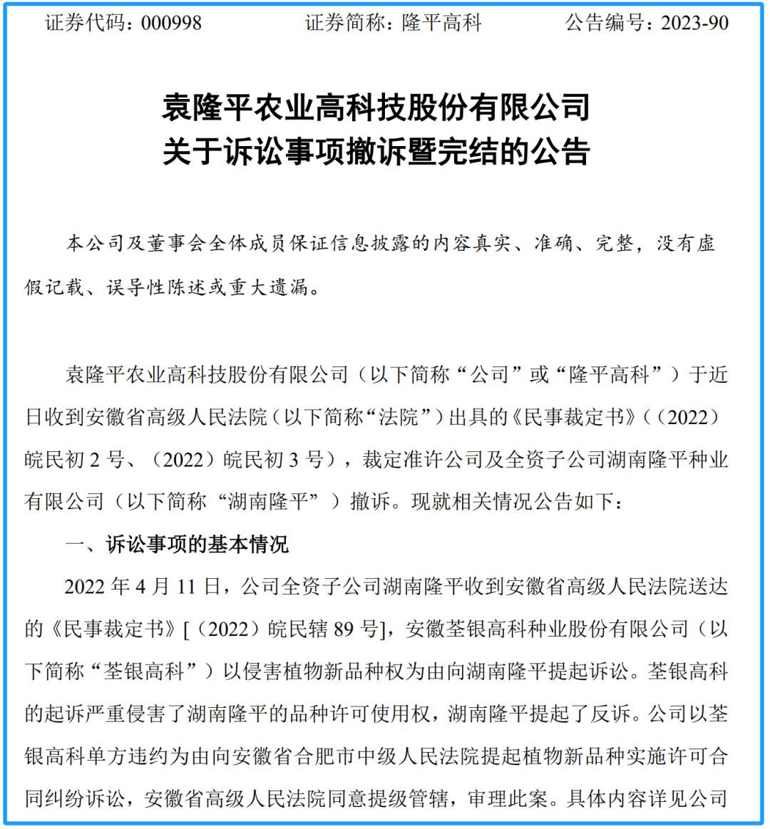 据两家上市公司披露,双方同为国家种业领军企业,承担着积极推进种业振兴、保障国家粮食安全的使命,协商就相关涉诉事项达成和解。同时,双方就涉案案件分别提出撤诉。
