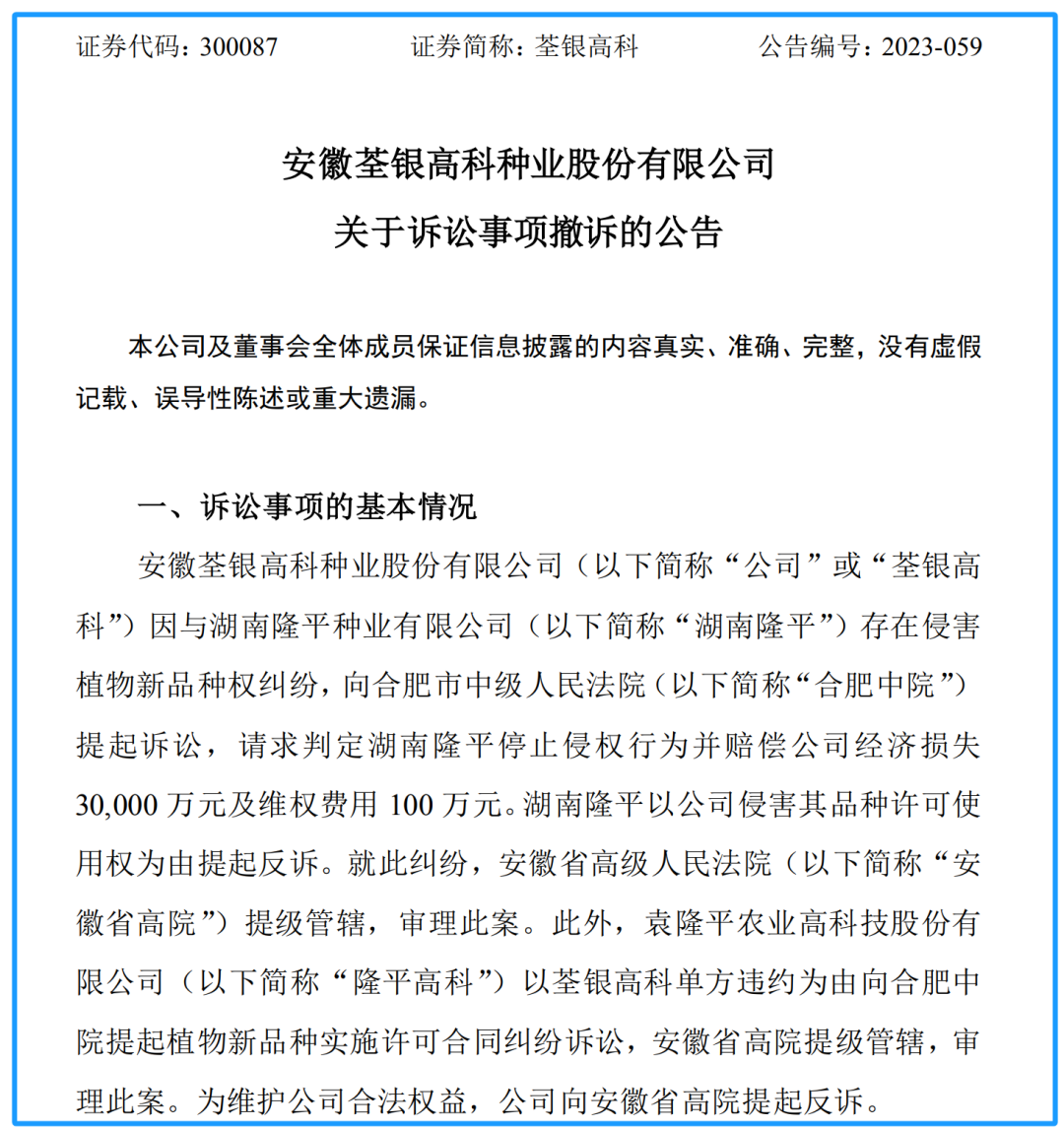 2022年4月中旬,荃银高科披露称,公司向合肥中院递交了《变更诉讼请求申请书》,将索赔金额5000万元调整为3亿元;同时,公司提请追加隆平高科为被告,与湖南隆平共同承担连带侵权责任。