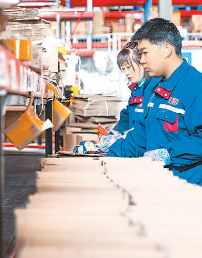 在中国(黑龙江)自由贸易试验区黑河片区,黑河跨境电商园区智能仓储物流中心的工人把打包好的货物通过传送带送到快递分拣场。