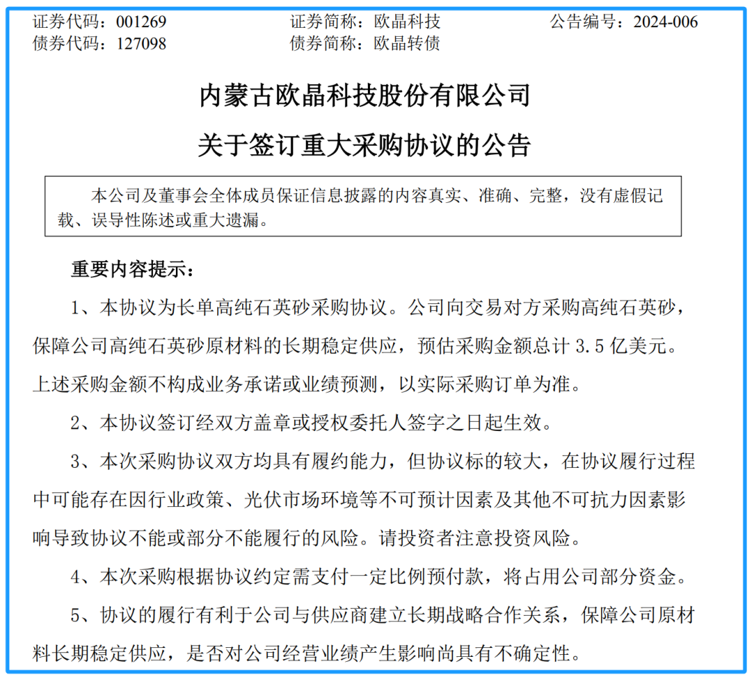 据欧晶科技公告,公司与矽比科签署了原材料高纯石英砂的采购协议,预估采购金额为3.5亿美元;协议总金额预计占公司2022年年度经审计总资产的比例超过50%。公司表示,上述协议是双方签订的日常经营性长单采购协议,协议的签订符合公司未来经营需要,通过分批采购的长单方式,有利于保障公司原材料长期稳定供应。