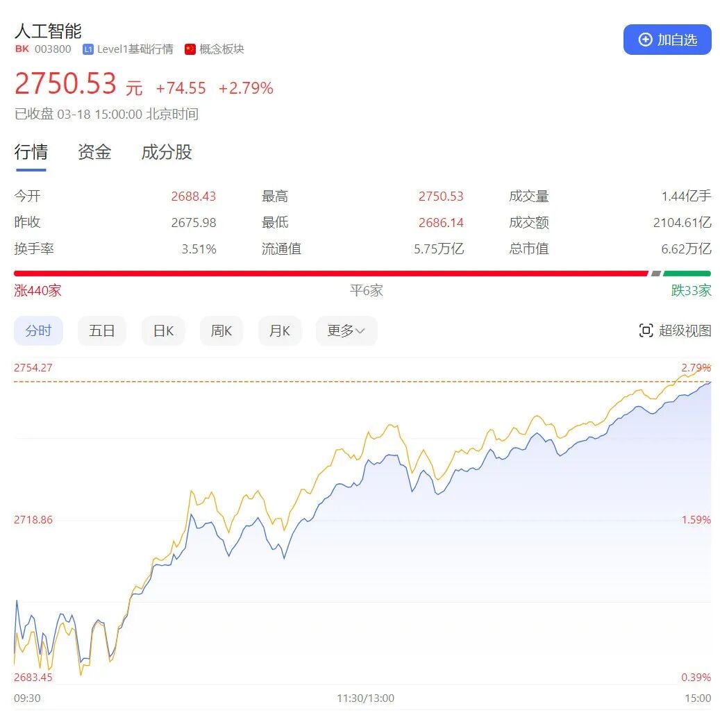 热点方面,人工智能概念再度全线上涨,板块指数放量上涨2.79%,创阶段性新高。