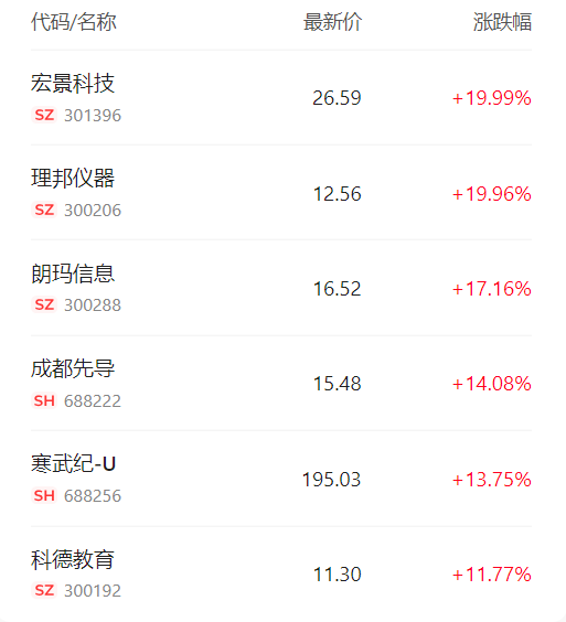 个股掀涨停潮,宏景科技、泓博医药20%涨停,朗玛信息、寒武纪、烽火通信等逾10股涨停或涨超10%,德明利、因赛集团等股价创历史新高(复权)。