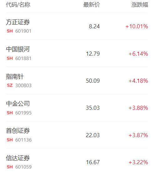 券商股因转融券“T+1”近日正式实施,也全线上涨,板块指数盘初一度直线拉升涨逾3%。所有个股飘红,无一下跌,方正证券涨停,中国银河、中金公司等涨幅居前。